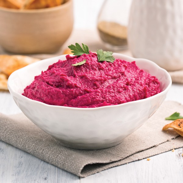 Dans la cuve d'un mixeur, placer les pois chiches cuits, la betterave coupée en morceaux, l'ail pelé, dégermé et coupé en deux, le tahini, le jus de citron, du persil ciselé, puis mixer.